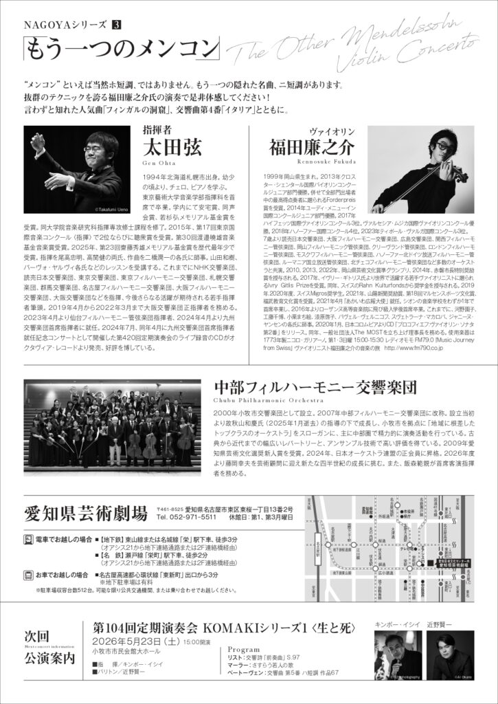 “メンコン”といえば当然ホ短調、ではありません。もう一つの隠れた名曲、ニ短調があります。抜群のテクニックを誇る福田廉之介氏の演奏で是非体感してください!言わずと知れた人気曲「フィンガルの洞窟」、交響曲第4番「イタリア」とともに。