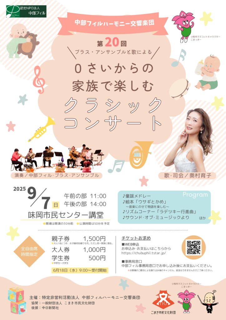 2025.09.06 お知らせ 9月7日(日)0さいからの家族で楽しむクラシックコンサート 当日券販売について 0さいからの家族で楽しむクラシックコンサート <当日券> ・中部フィルオンラインチケットサイト https://chubuphil.tstar.jp/ ・会場入り口窓口(午前の部 10:30~/午後の部 13:30~)